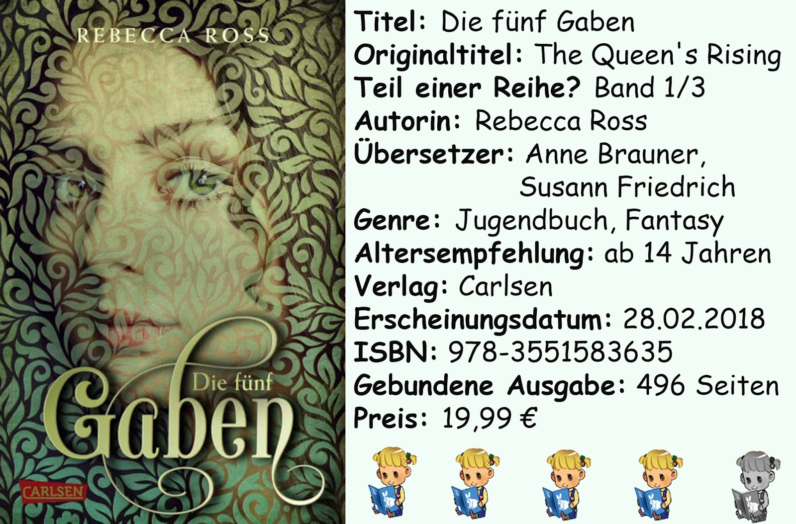 “Die fünf Gaben” brauchte eine Weile um einen Sog auf mich auszuüben, aber dann hat es mir wirklich gut gefallen. Ab der Hälfte ist es spannend und ich mochte den Weltenentwurf, sowie Brienna als Protagonistin. Man darf sich nur nicht von dem zähen Anfang abschrecken lassen.