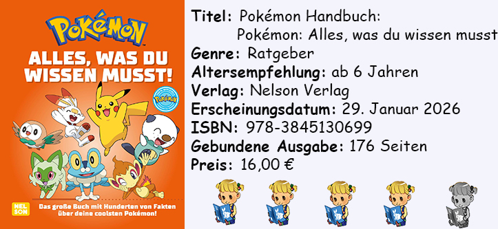 Für recht neue und junge Pokémon-Fans ist es zwar definitiv das Richtige, für ältere jedoch eher nicht. Dennoch können wir das Buch empfehlen, das es für jüngere Leser*innen ausgelegt ist und diese garantiert ihren Spaß an dem Buch haben werden. Vor allem die verschiedenen Fakten der Pokémon fanden wir schön dargestellt.